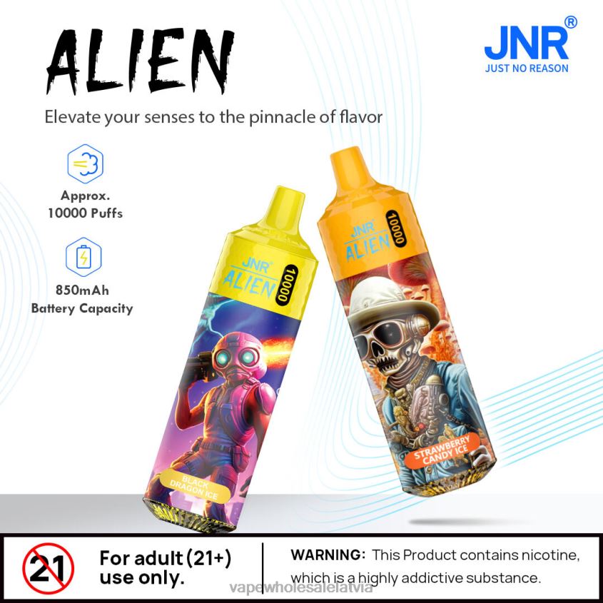 Alien nodrošina vienmērīgu vilkmi un aromātiskus tvaikus ar 1,2 spoli, kas lepojas ar iespaidīgu jaudu, aptuveni 10 000 dvesmu, ko darbina 850 mah akumulators. Iepriekš iepildīts ar 20 ml e-šķidruma, tas nodrošina daudzveidīgu vairāk nekā 30 garšu klāstu, sākot no atsvaidzinoša ledus līdz apburošiem augļiem. C tipa uzlādes pieslēgvietas ērtības nodrošina ātru un netraucētu uzlādi.